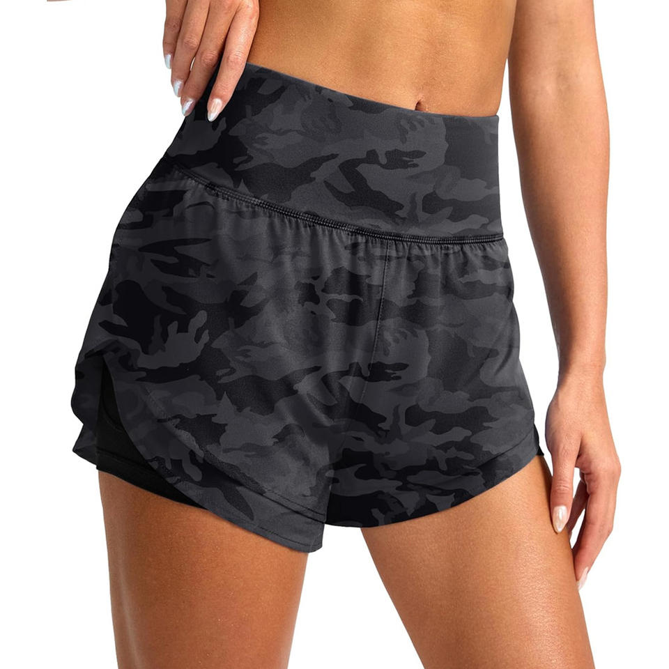 Pantalones cortos deportivos 2 en 1 de verano para mujer, diseño transpirable personalizado, pantalones cortos de entrenamiento para gimnasio, compresión interna, fábrica de producción OEM