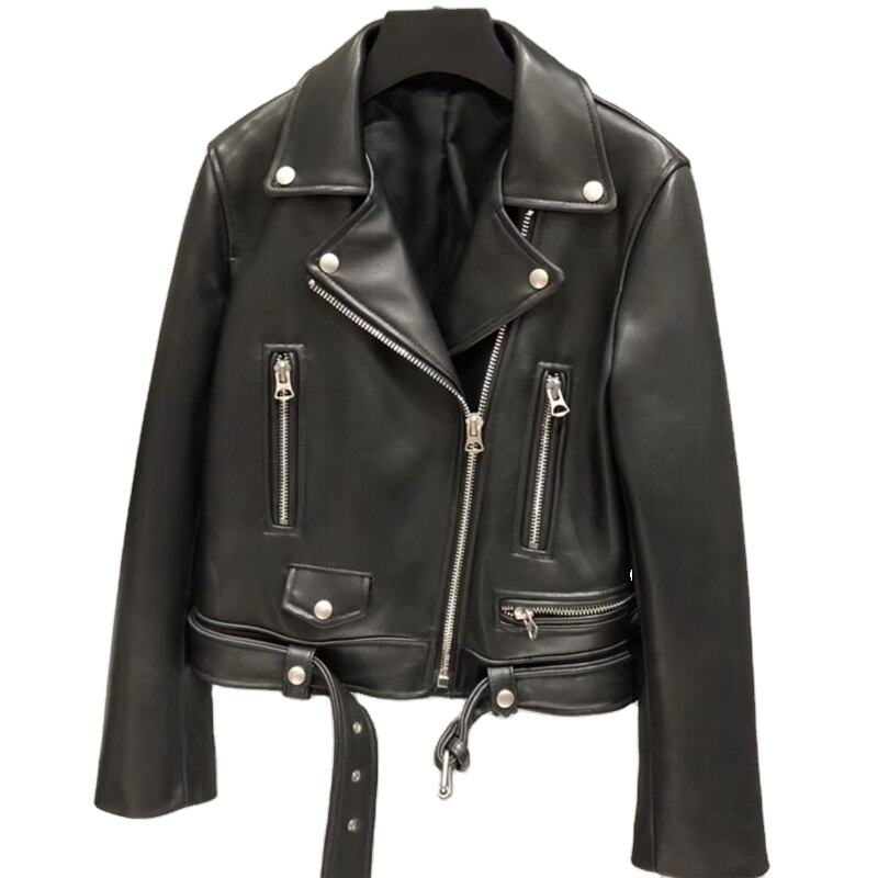 Chaqueta de Cuero Genuino para Mujer, Logotipo Personalizado OEM, Cuero Real de Cordero y Vacuno, Estilo Urbano de Motociclista, Venta al por Mayor Directa de Fábrica