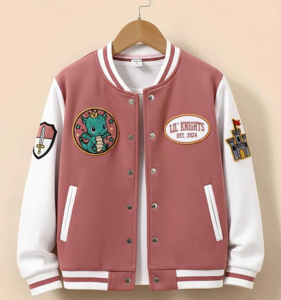 Chaqueta Bomber Varsity con parches con letras para Mujer | Estilo béisbol con botones | Color melocotón
