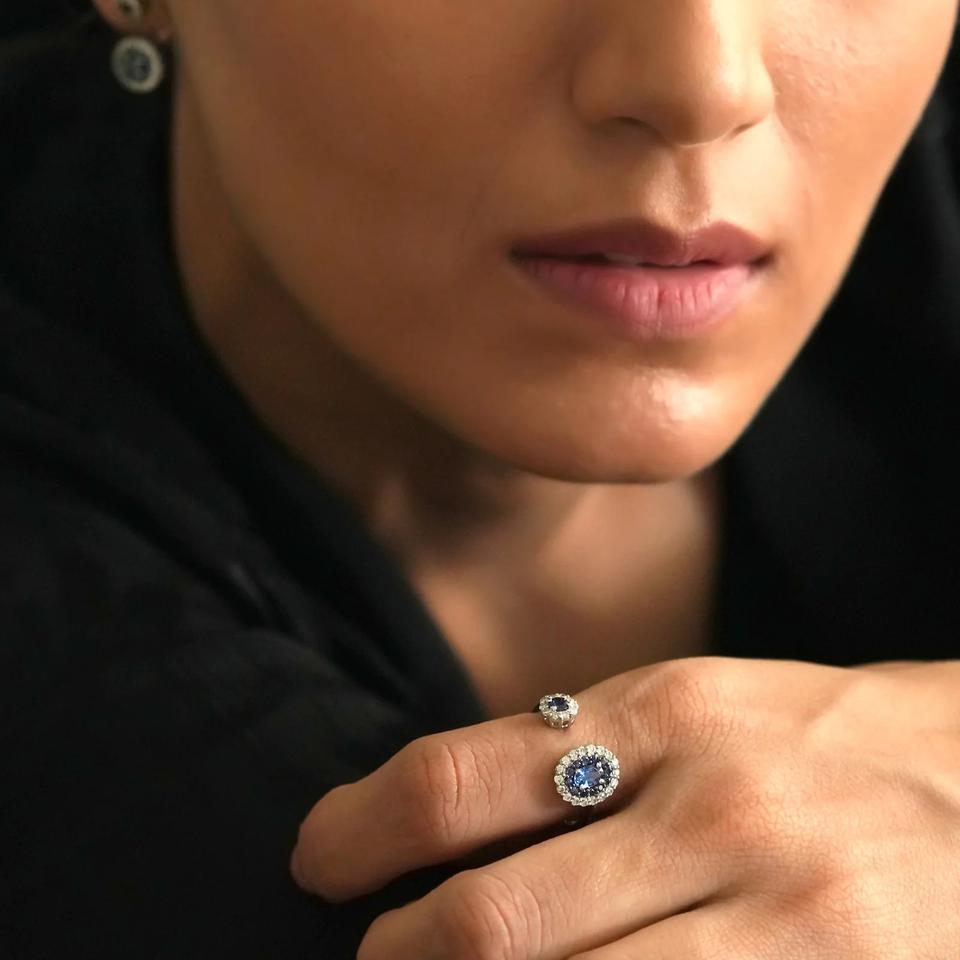 Anillo de Compromiso de Diseño Original para Mujer, Plata de Ley 925, Estilo Toi Et Moi, Corte Redondo, Halo con Zafiro Azul, Anillo de Diamante Moissanita