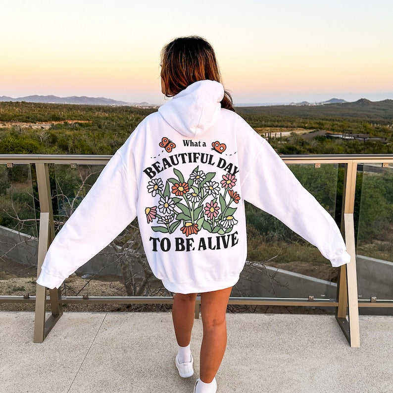 Sudadera con capucha extragrande de invierno para mujer, beige, con estampado gráfico en la espalda, manga larga, estilo casual urbano, holgada, de forro polar
