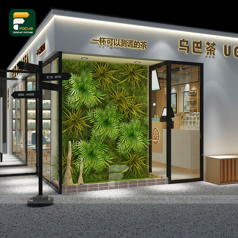 Mostrador de tienda de té de leche de madera, área de recepción de piedra de terrazo, tienda de bebidas personalizada, diseño de muebles, espacio minorista moderno