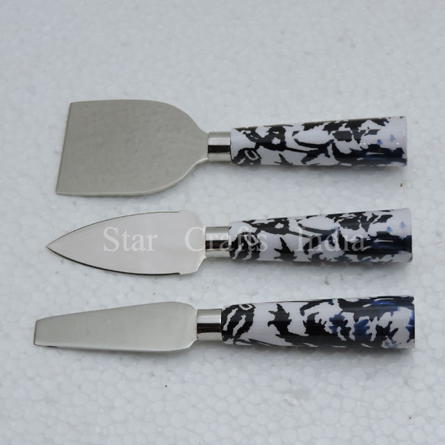 Juego de cuchillos para queso con mango de madera y resina y hoja de acero inoxidable, juego de cubiertos de alta calidad de acero inoxidable de 3 piezas