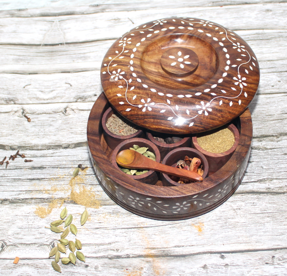 Caja de especias de madera, contenedor de especias, caja artesanal con forma de flor y tapa, tarros de especias para sal y pimienta de cocina