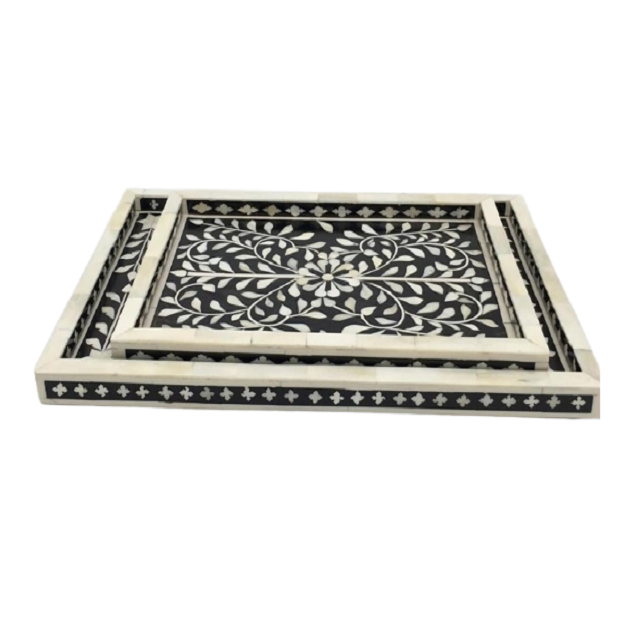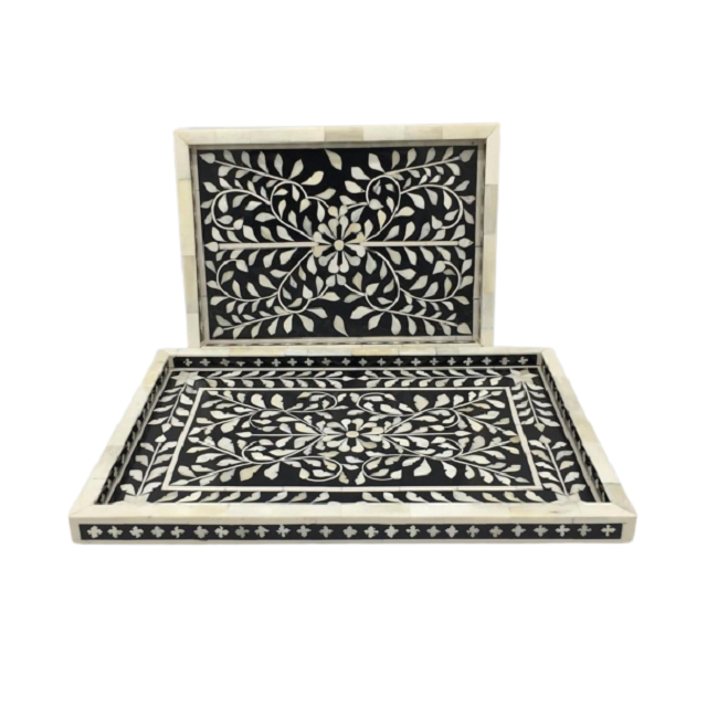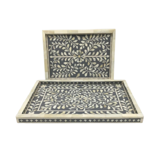 Juego de dos bandejas de diferentes tamaños para té y café, de madera y con incrustaciones de nácar, para uso doméstico y en restaurantes.