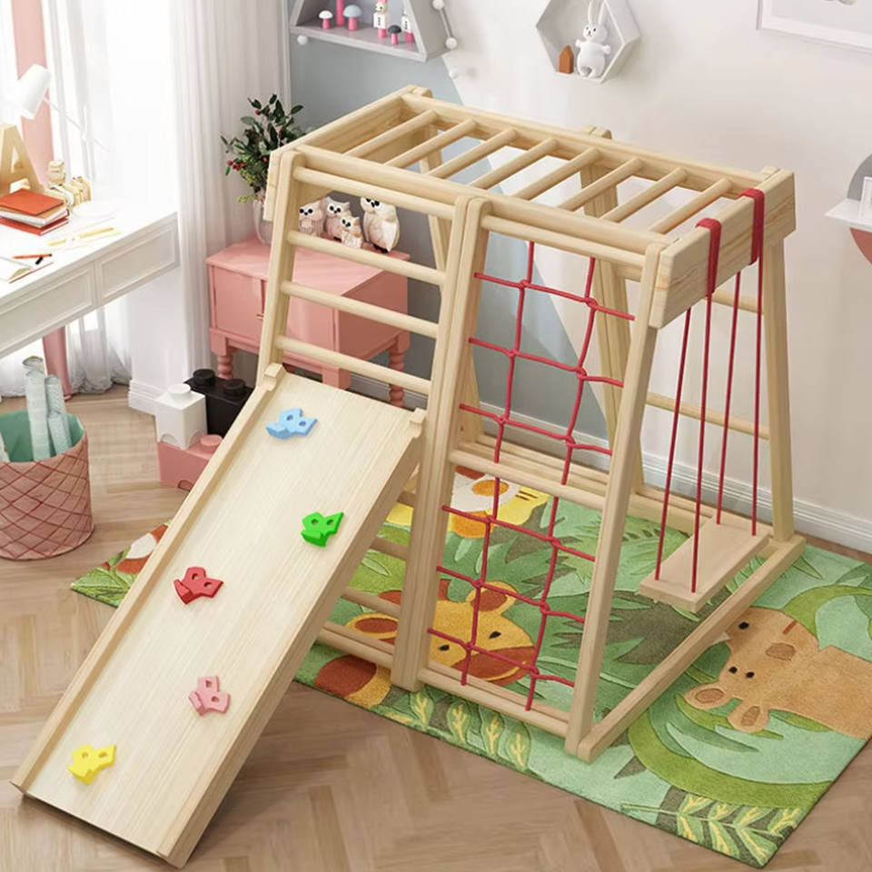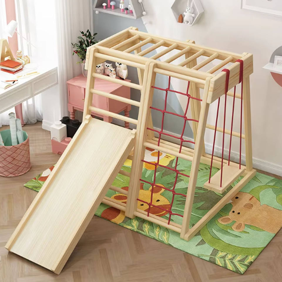 Estructura de juego interior de madera con tobogán y red de cuerda para niños de 2 a 8 años, diseño unisex.