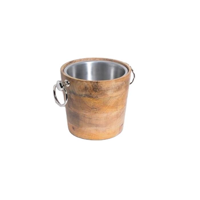 Cubitera de hielo con cubierta de madera natural, cubo de hielo sólido de madera con mango de acero y cubos de hielo, bañeras de bebidas con mango hechas en la India