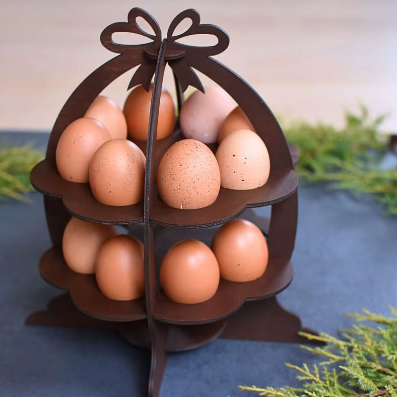 Estante de madera para huevos para almacenamiento en la encimera de la cocina, que proporciona una exhibición organizada de huevos con un encanto estilo granja.