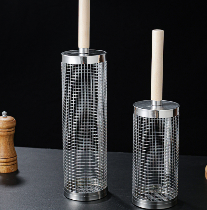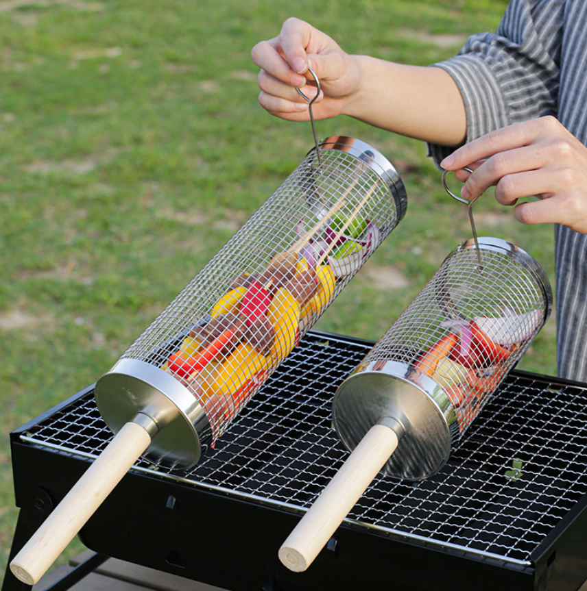 Cesta de barbacoa portátil con mango de madera, antirrobo, de acero inoxidable 304, para exteriores, con tubo y red para asar.