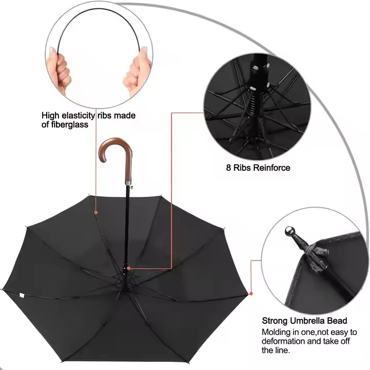 Name:Auto Opening Classic Golf Umbrella with Wooden Hook Handle