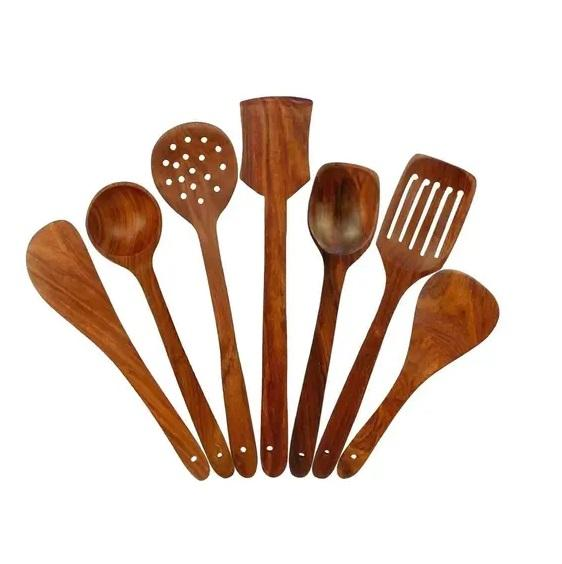 Juego de Utensilios de Cocina Antiadherentes de Madera 100% Teca Natural Incluye Espátula para Freír, Tenedor para Ensalada y Cucharas de Saniya Handicraft