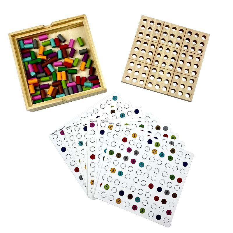 Detalle:81 clavijas de madera, 10 tarjetas y solución