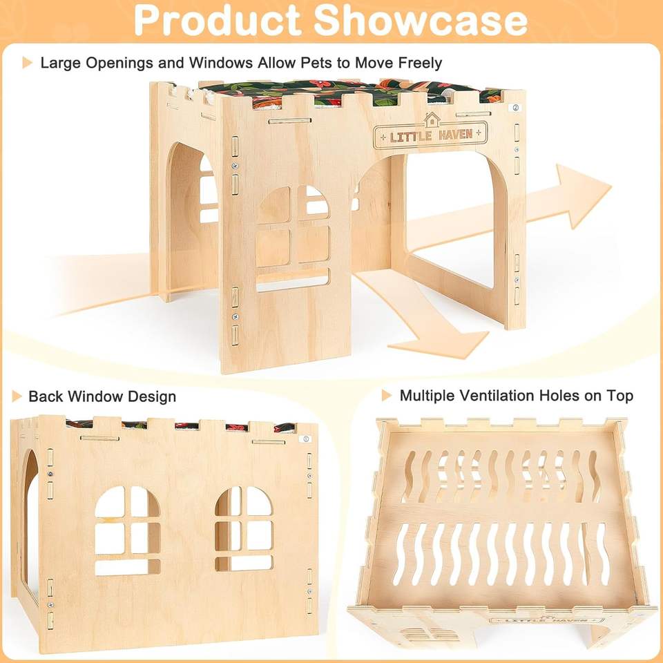 Casa de Madera para Conejos, Castillo Escondite Grande para Interiores, Caseta para Conejillos de Indias, Jaula para Conejos, Accesorios para Hámster y Chinchilla