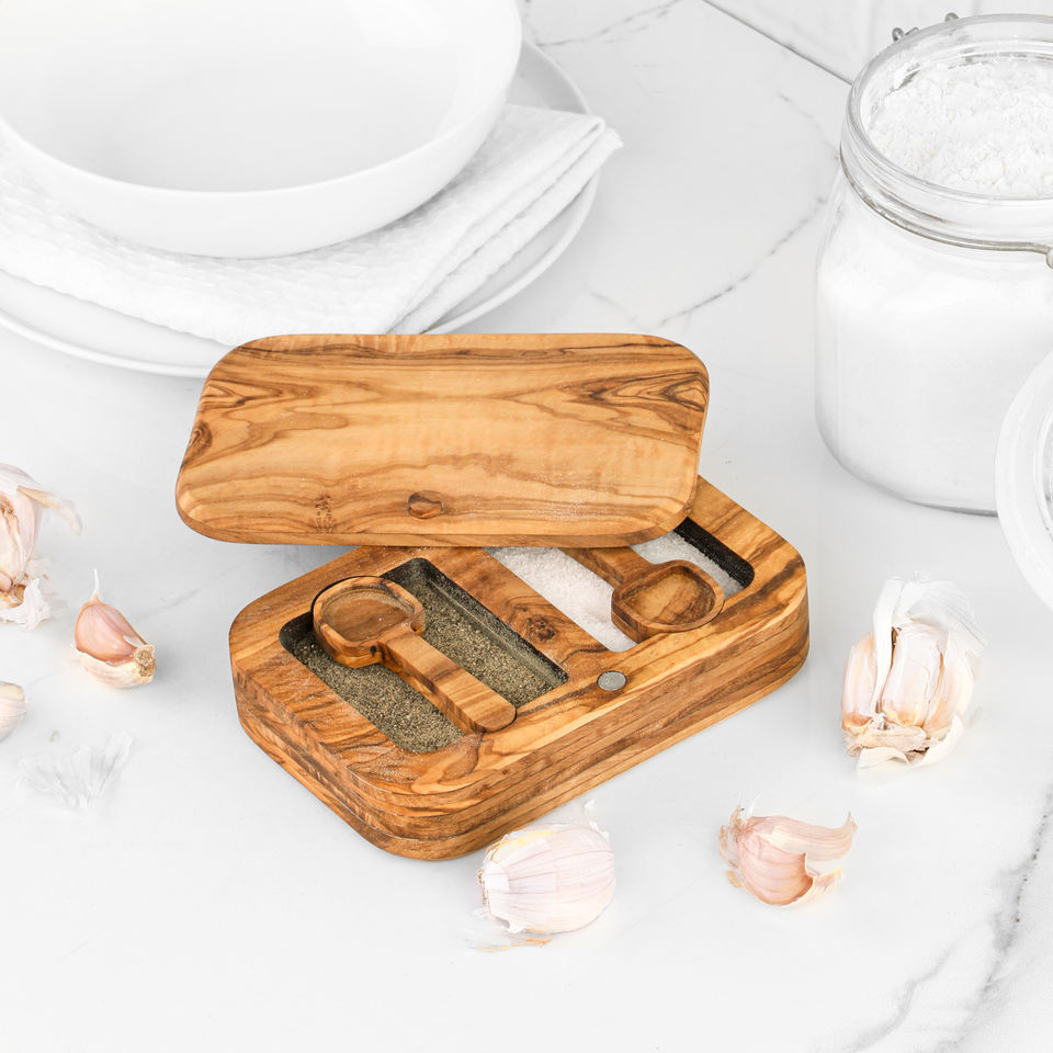 Salero de madera con compartimentos, salero de sal y pimienta con tapa, caja de sal de madera de oliva con cuchara