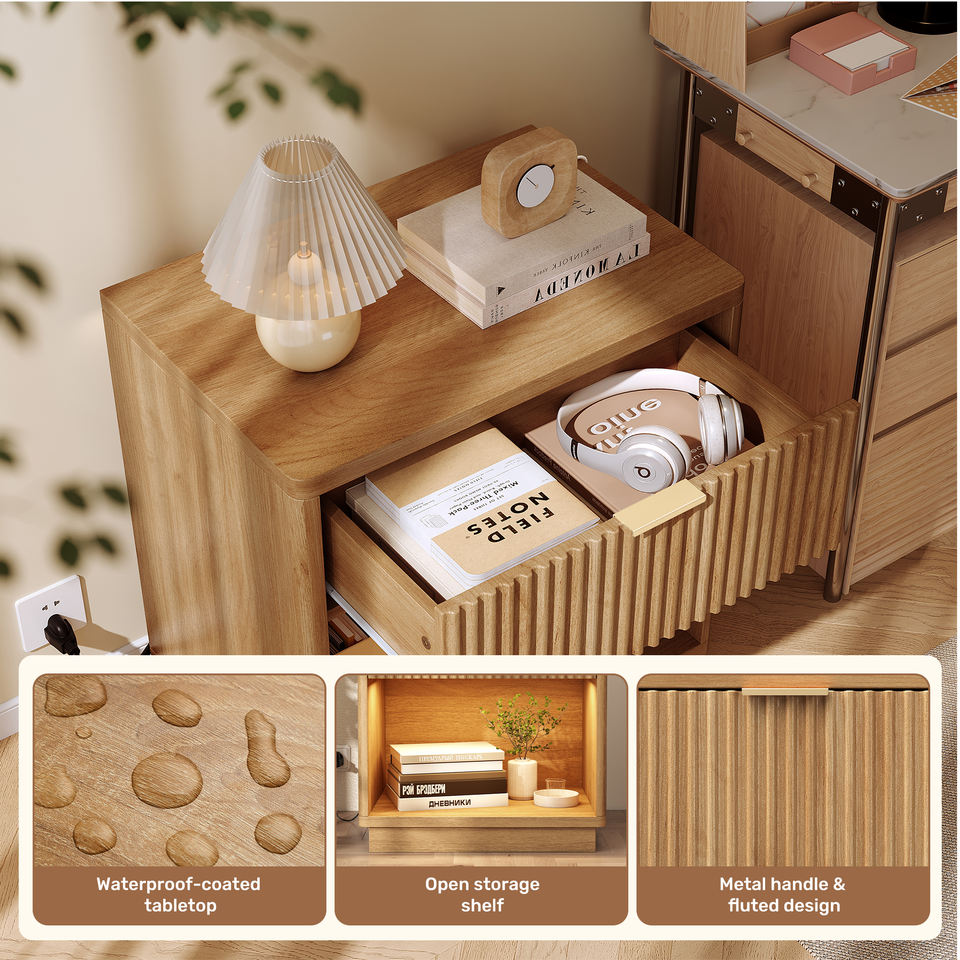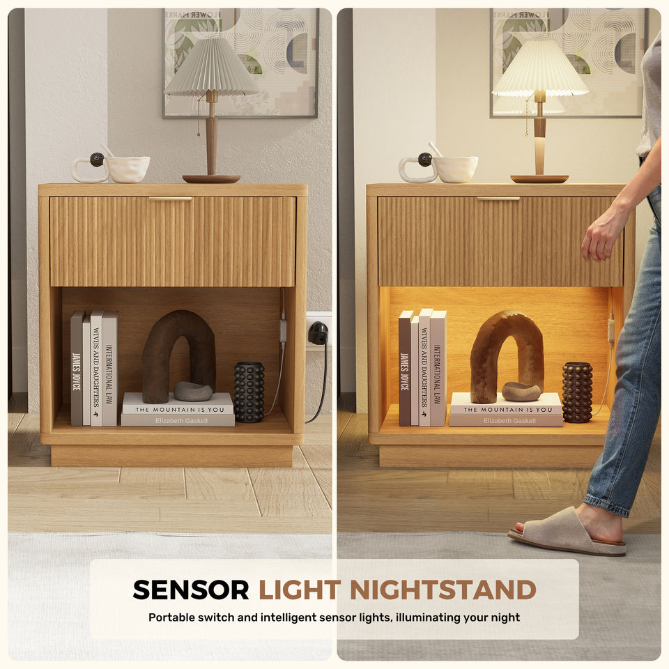 Mesita de Noche Moderna Ecológica de Madera con Sensor LED, Puertos USB, Tomas de Corriente, Luz RGB, Modo Música y Función de Temporizador para Apartamento o Comedor