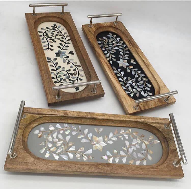 Bandeja de madera para servir con Incrustaciones de nácar, elegante bandeja decorativa con asas para té, café, aperitivos y decoración del hogar