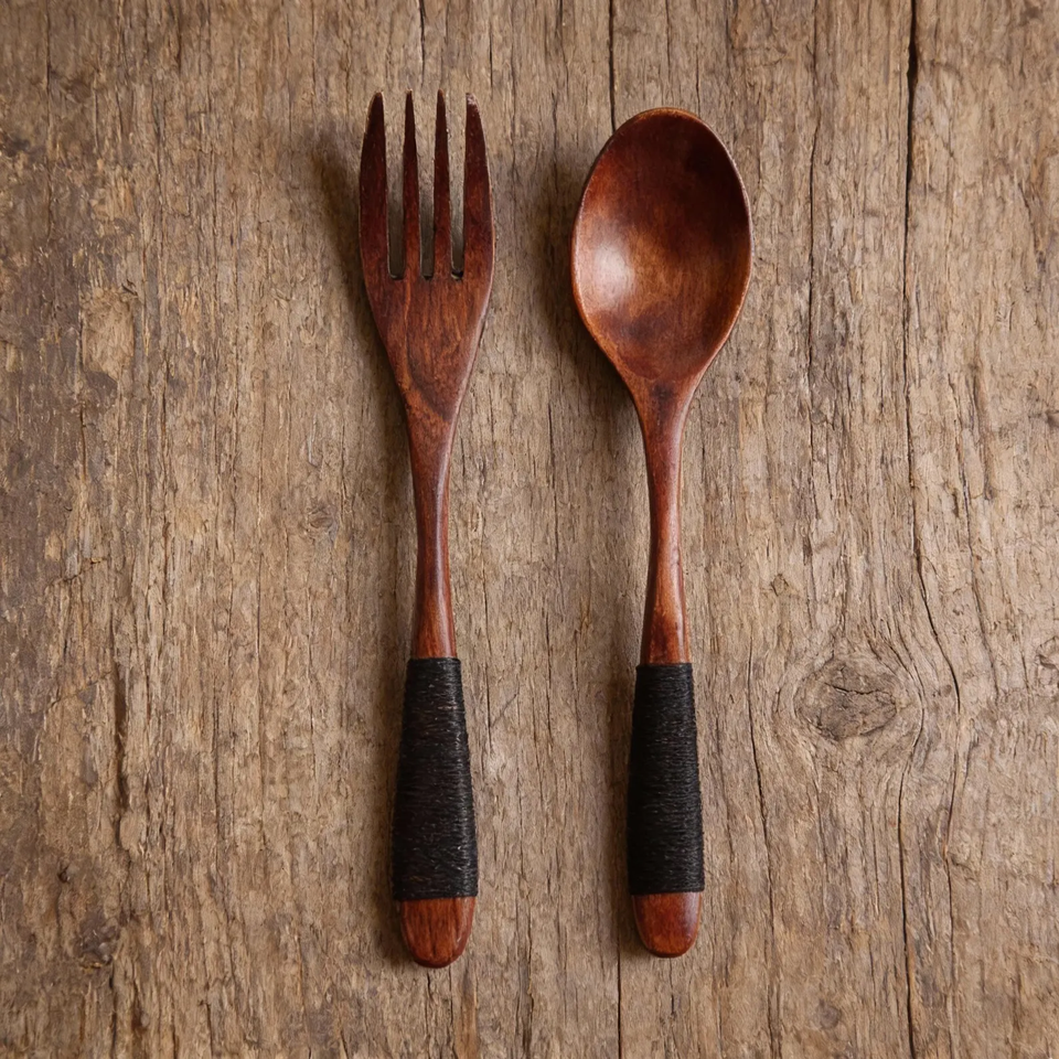 Juego de cuchara y tenedor de madera con mango envuelto – Utensilio natural hecho a mano