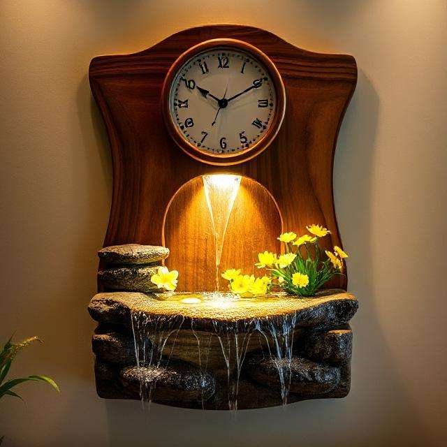 Decoración de madera montada en la pared con estilos cruzados de animales de Ángel tallado con reloj flor amarilla cascada fuente Material de piedra