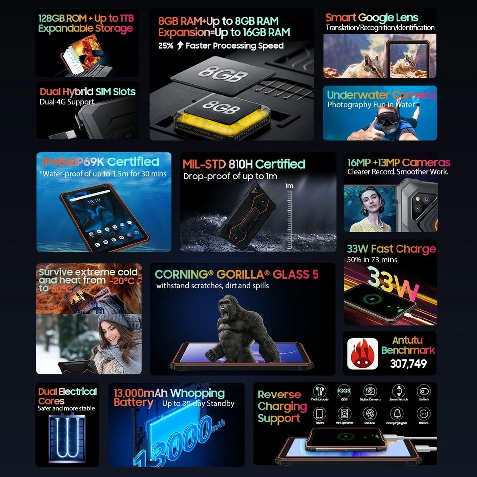 Estreno mundial OSCAL Spider 8 Rugged Tablet PC Pantalla FHD de 10,1 pulgadas Android 13 T616 16GB 128GB Tablet PC13000mAh con 33W