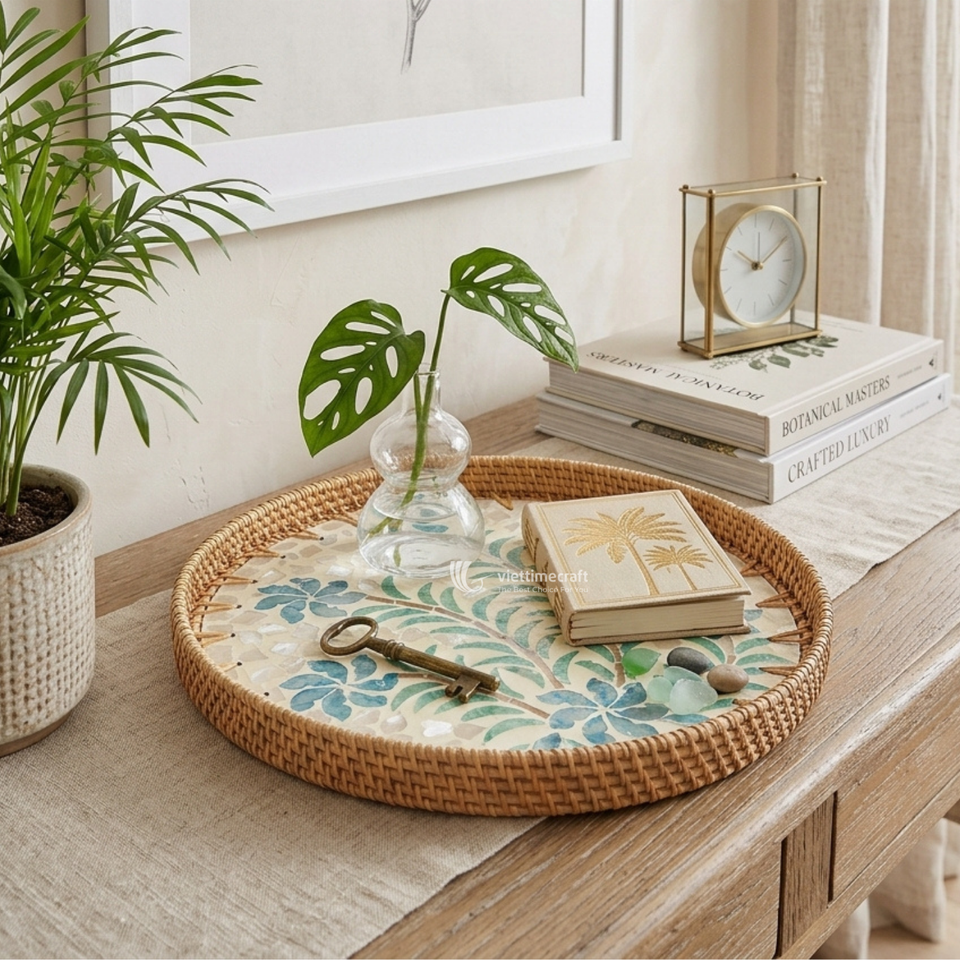 Bandeja Redonda Tejida de Ratán con Base de Incrustaciones de Madreperla Floral Azul, Bandeja Decorativa con Mosaico de Conchas para Mesa de Centro y Decoración del Hogar