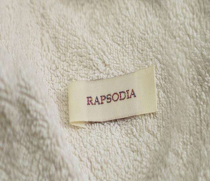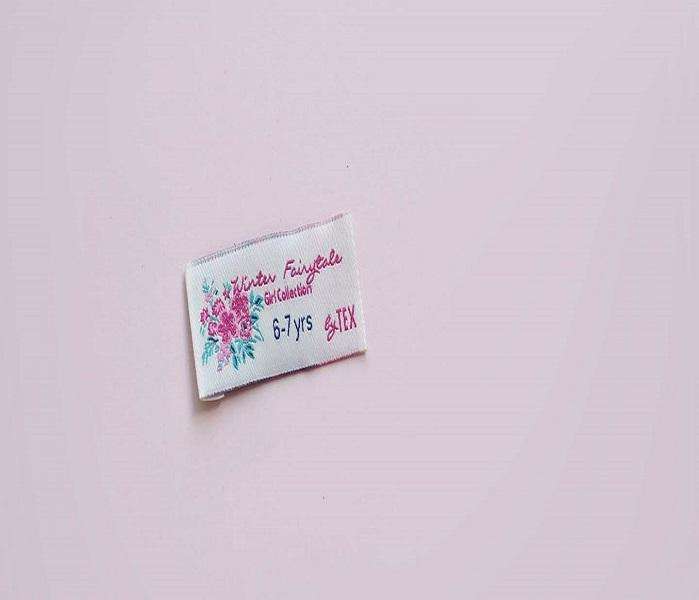 Etiquetas textiles tejidas para ropa con logotipo personalizado, tipografía, detalles de talla e instrucciones de cuidado de la prenda.