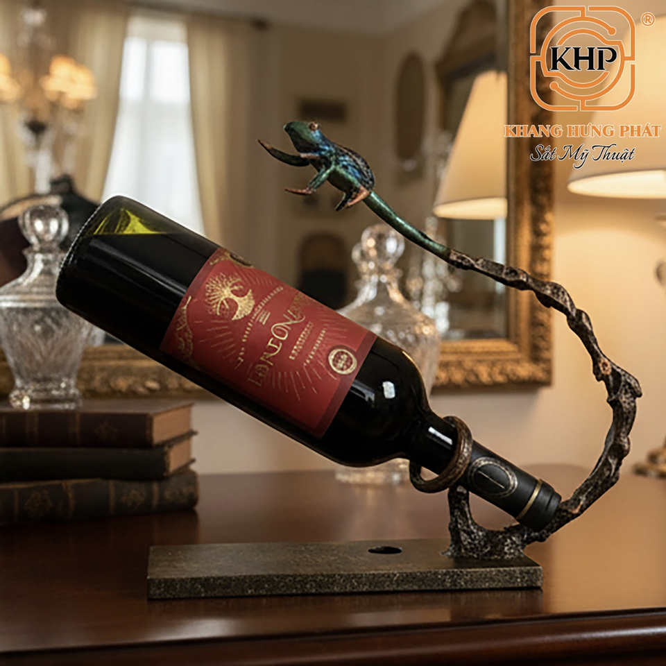 Estante para Vino de Hierro Forjado 100% Hecho a Mano, Soporte Decorativo para una Sola Botella con Diseño de Rana, Decoración Vintage de Lujo para el Hogar, Hecho en Vietnam