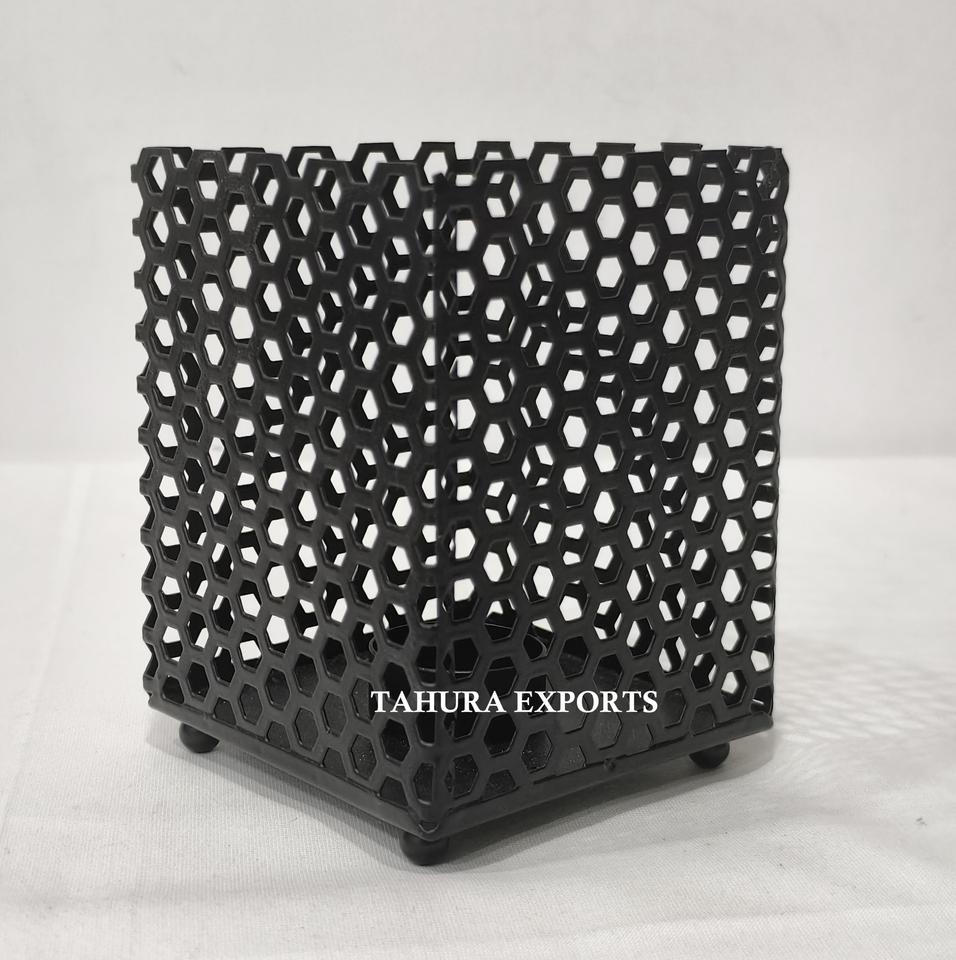 Portavelas de red de metal forjado para ajustes de decoración industrial que agregan textura ligera y encanto a la sala de estar u oficina urbana
