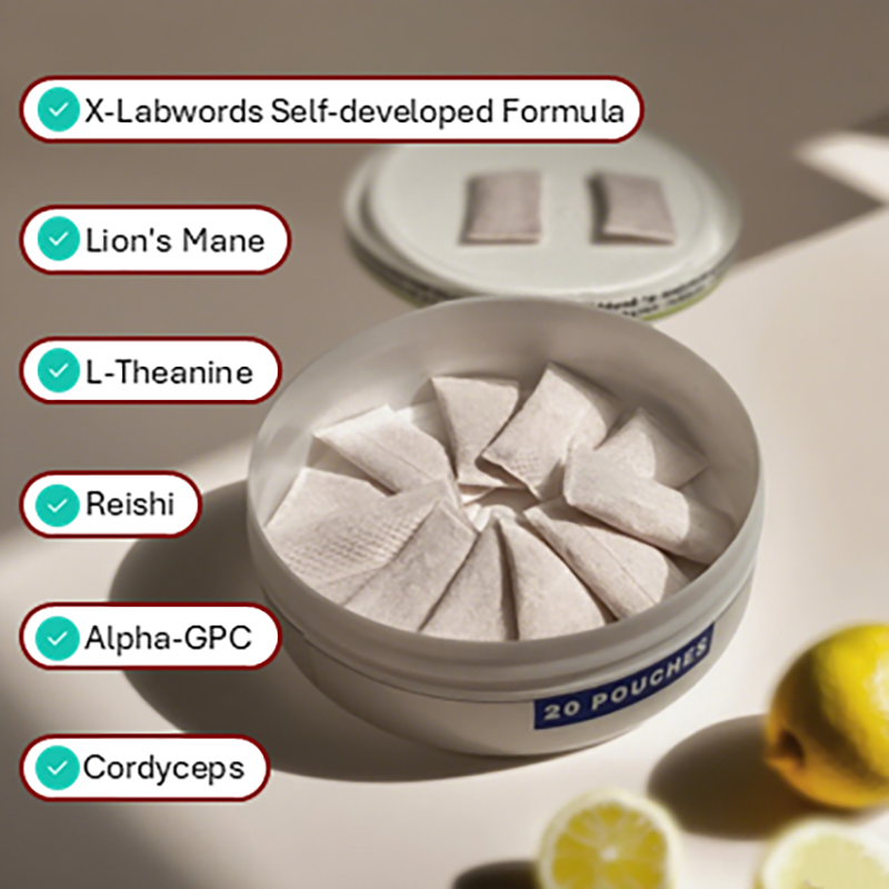 Ingrediente principal:Celulosa microcristalina, Alcohli Azúcar, Edulcorante A016 (desarrollado por X-Labworks), Agente de enfriamiento B008 (desarrollado por X-Labworks), Agua, Guaraná, Cafeína