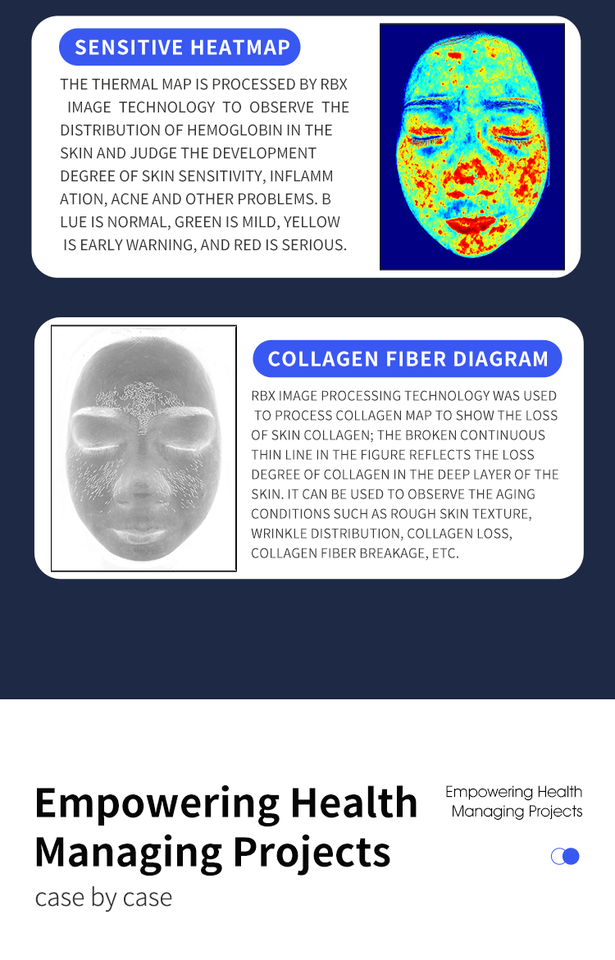 El acné análisis, La pigmentación de análisis, La piel arrugas análisis, Detectar la humedad de la piel, Blanqueador, Rejuvenecimiento de la piel, Limpieza de manchas, Pérdida de peso, Quita arrugas, Reafirmante, Hidratante, limpiador de poros
