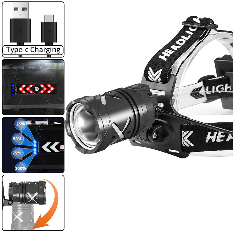 Linterna Frontal LED XHP70 de 30W Recargable, Alta Luminosidad, Zoom Ajustable, Iluminación para Exteriores