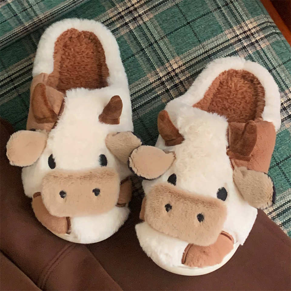 XIXITIAO Pantuflas Cálidas y Lindas para Mujer y Niña, Suela Antideslizante de Felpa Suave, Diseño de Vaca, Zapatos de Invierno
