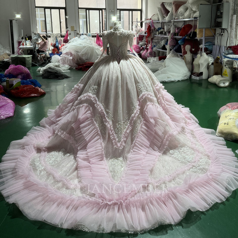 Vestidos de Quinceañera XS212 Princesa Rosa con Volantes y Manga Larga para Chicas Dulces de 16 Años