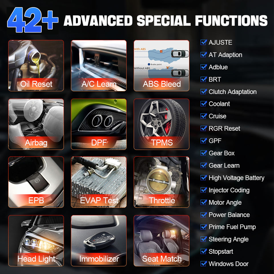 Función:OBD2 + control bidireccional + codificación + PMI + 42 + función de reinicio