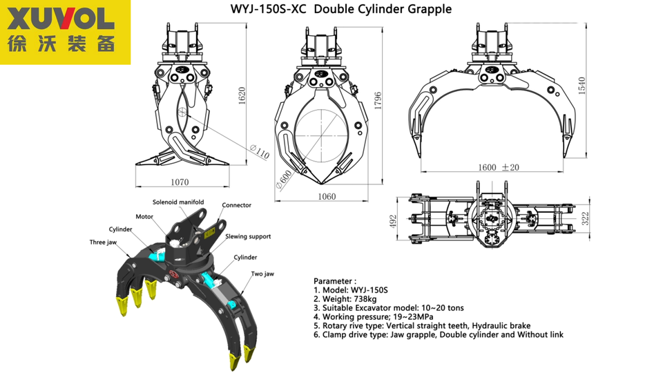 Nombre del producto:XUVOL 150S Grab con accesorio de garra hidráulica para miniexcavadora de 360 grados