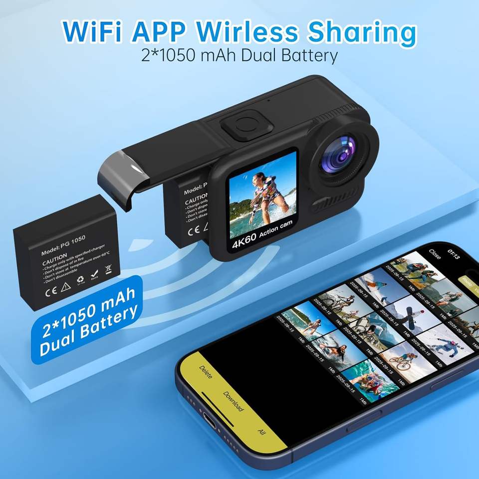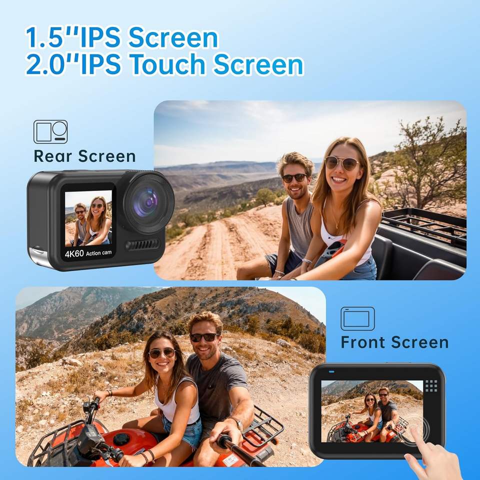 Cámara de Acción Xoieod 4K60, Pantalla Dual de 2 Pulgadas, Resistente al Agua 30M, Cámara Deportiva con Estabilización de 6 Ejes, Lente de 64mm, Apertura F3.7