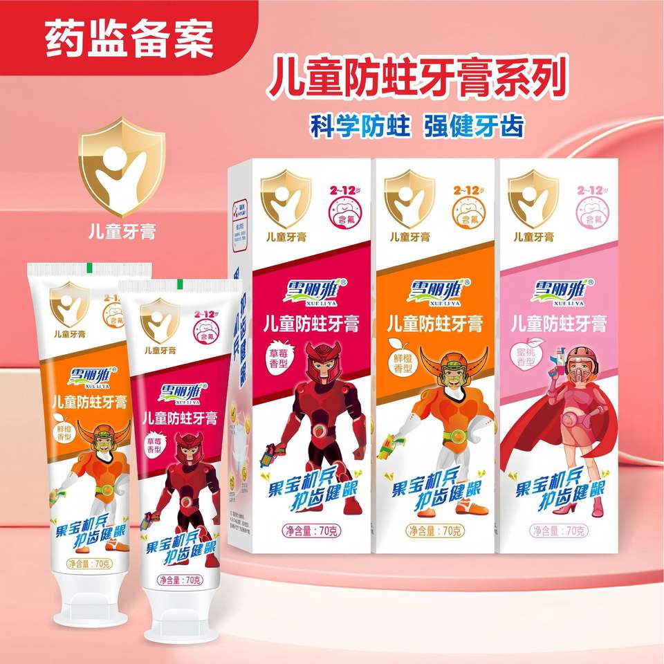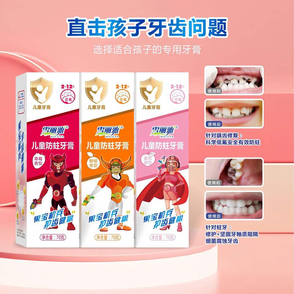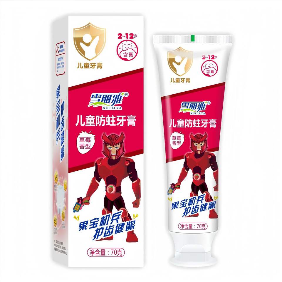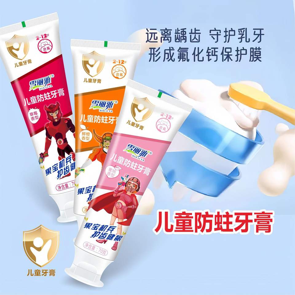 Pasta de dientes para niños Xue Li Ya 70g Anti-caries Para edades de 2 a 12 años Con fluoruro Sabores de fresa, naranja y melocotón