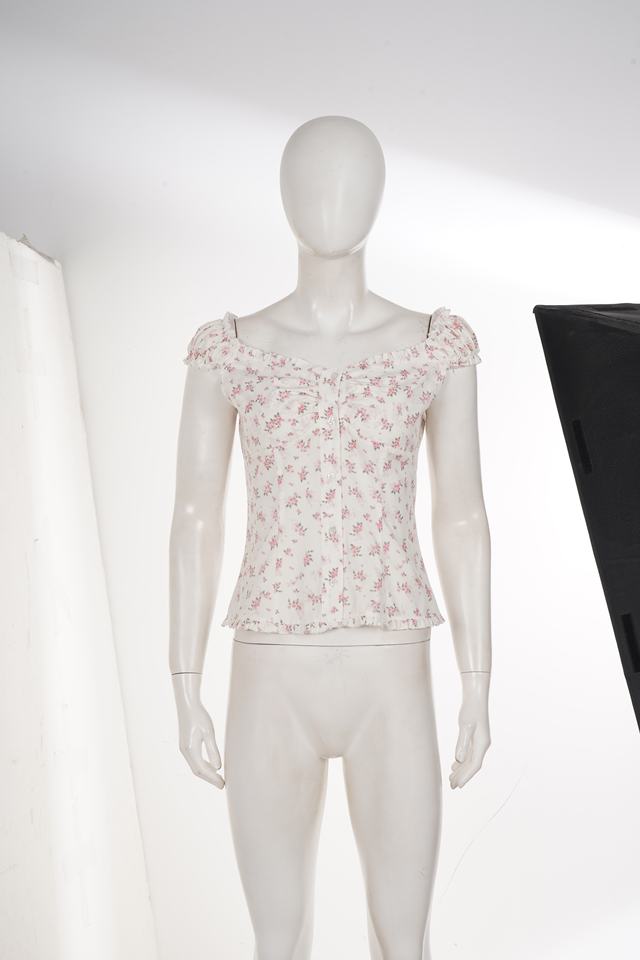 Blusa Y2K Blanca y Rosa con Volantes Florales, Estilo Corsé con Botones al Frente y Hombros Descubiertos, Linda Blusa Estilo Coquette Cottagecore