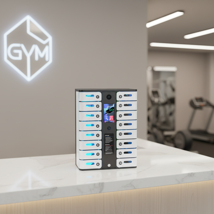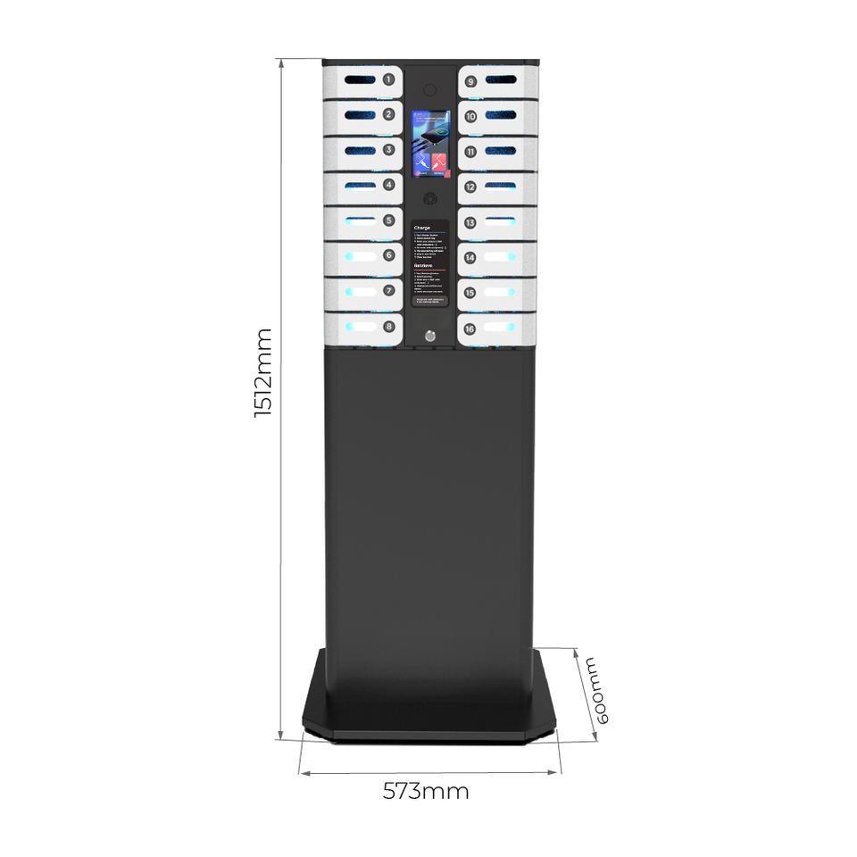 Y2Power MAX, Estación de Carga Rápida para Teléfonos con 16 Compartimentos, Multi-idioma, Opcional con Pantalla para Anuncios y Base Completa con Soporte de Piso