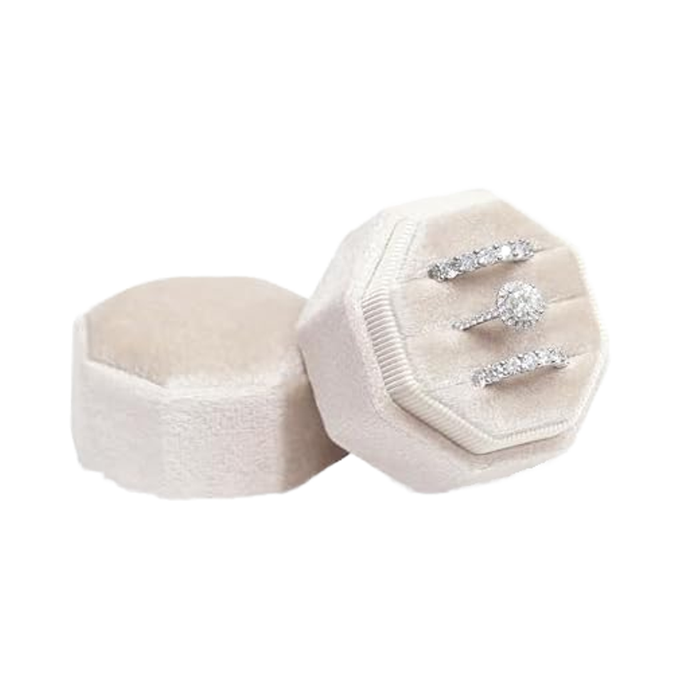 YISHANG logotipo personalizado microfibra y PC joyería anillo caja cuadrado Octágono compromiso Boda nupcial fotos recuerdo almacenamiento