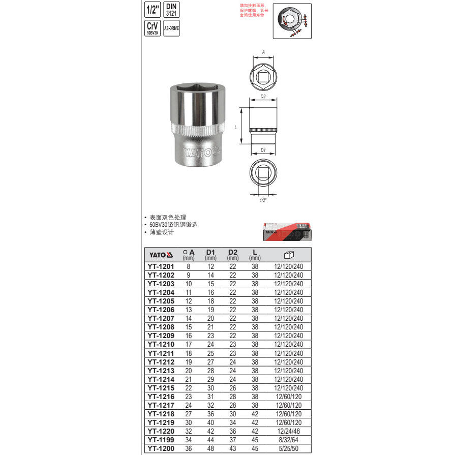 Llave de Tubo Yato de 1/2 Pulgada y 8 mm, Acero al Cromo Vanadio, Herramienta de Reparación Automotriz con Punta Hexagonal YT-1201