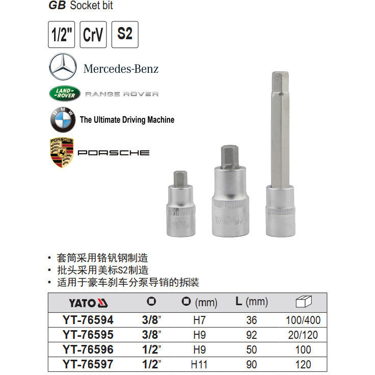 Juego de Puntas de Vaso Yato de 1/2 Pulgada H7 H9 H11 para Extracción de Pinzas de Freno Mercedes Benz BMW Porsche