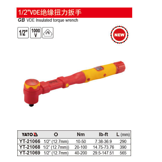 Llave Dinamométrica Aislada Yato VDE de 1/2 Pulgada, Métrica, Industrial, de Acero Aleado, 250 Lb Ft