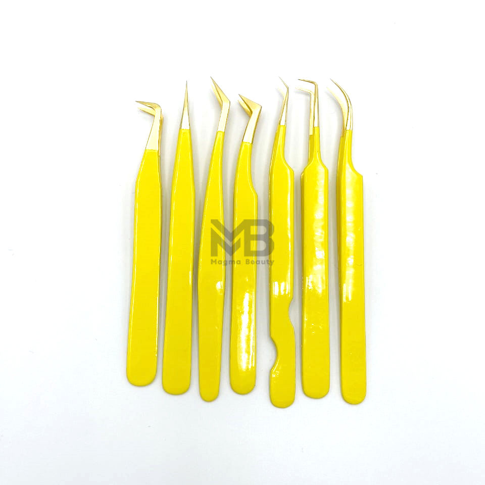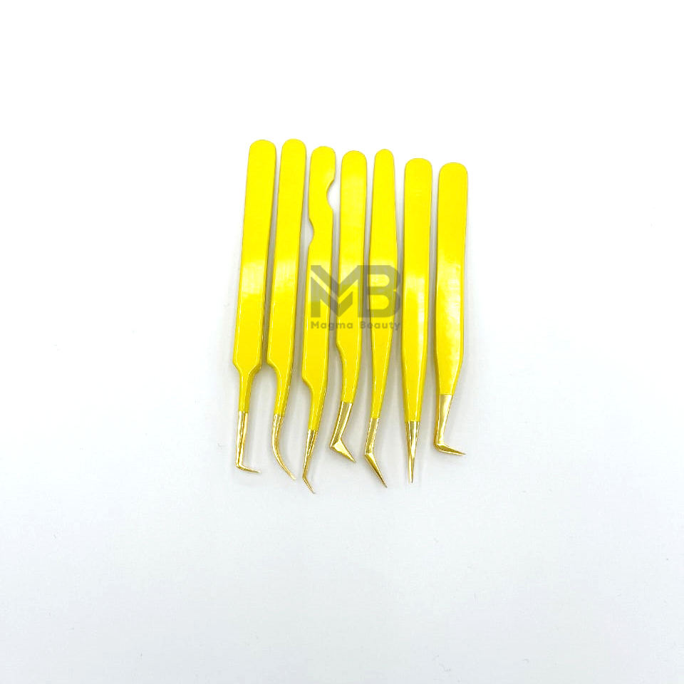 Pinzas de extensión de pestañas de 10mm de longitud antimagnéticas con puntas doradas recubiertas de Color amarillo, agarre liso japonés de acero inoxidable personalizado