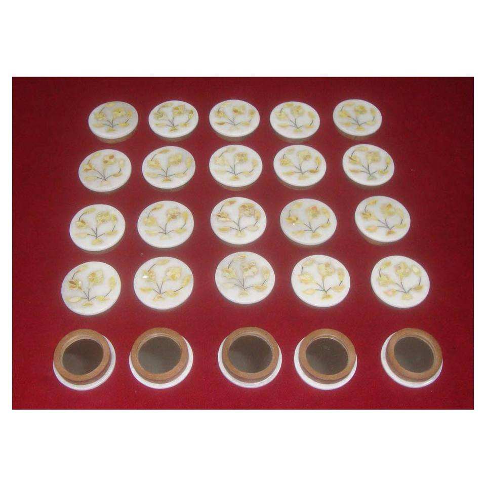 Espejo incrustado de mármol blanco con forma redonda, diseño de flores de color amarillo, superficie lisa y brillante con acabado fino