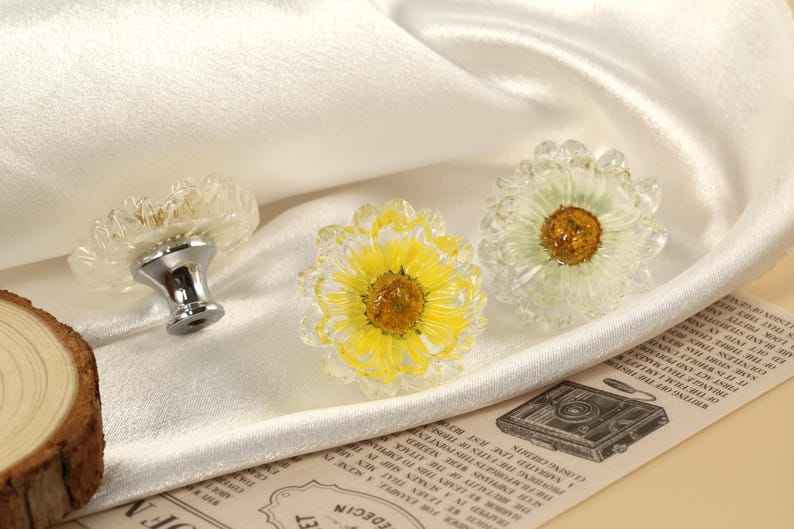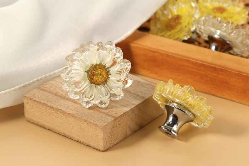 Perillas para cajones de armario con diseño de margarita amarilla, perillas de resina para armario con margarita, flor transparente grabada a medida