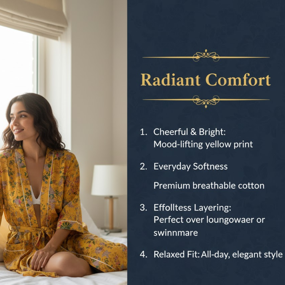 Bata de algodón con estampado floral amarillo, cuello en V, manga larga, estilo kimono, bata de baño larga con bolsillos y cinturón con cordón.