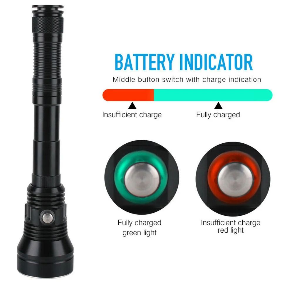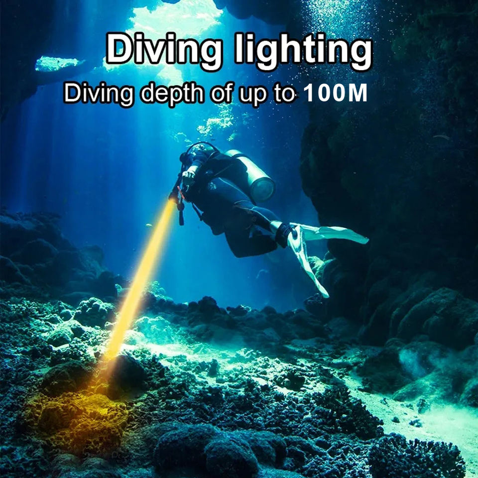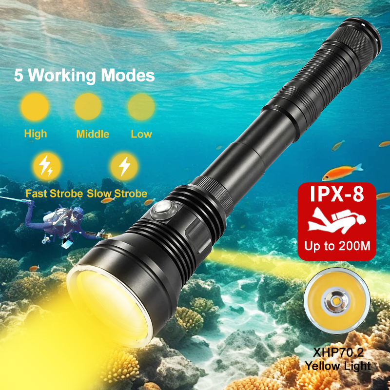 Linterna de buceo con luz amarilla, 5 modos de trabajo, ultrabrillante XHP70.2, impermeable, subacuático, pesca submarina, antorcha de buceo, luz Flash