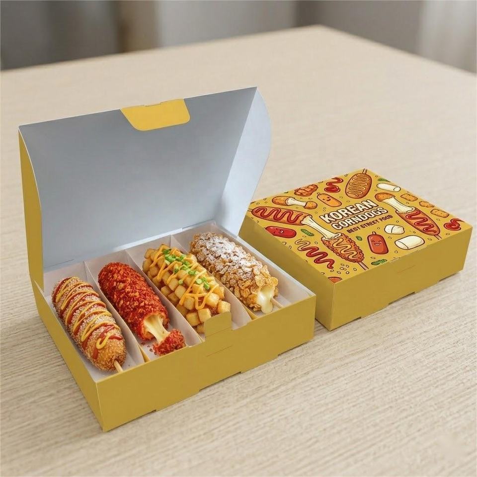 Caja Desechable de Papel Amarillo con 4 Compartimentos para Corn Dogs de Queso, Impresión Personalizada, Empaque para Comida Rápida
