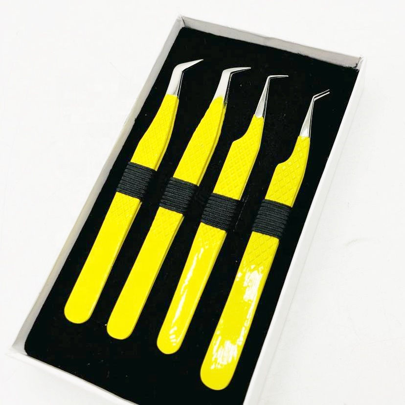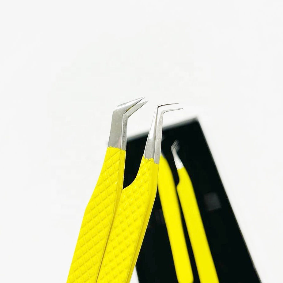 Pinzas de pestañas de precisión de acero inoxidable con recubrimiento de polvo amarillo Precios al por mayor para extensiones de pestañas de volumen sostenible en punta
