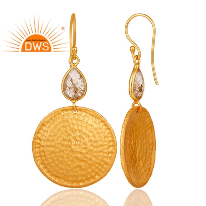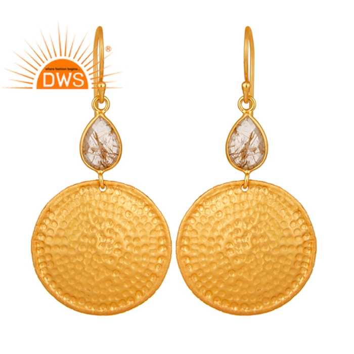 Pendientes colgantes de disco martillado de rutilo amarillo, fabricante de joyería de plata de ley chapada en oro de 18k